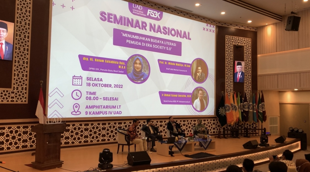 Fakultas Sastra, Budaya, dan Komunikasi (FSBK) Universitas Ahmad Dahlan (UAD) menyelenggarakan seminar nasional dengan tema “Menumbuhkan Budaya Literasi Pemuda di Era Society 5.0” pada Selasa, 18-10-2022. Bertempat di Amphitarium Gedung Utama Kampus IV UAD, acara ini menghadirkan tiga pembicara yaitu Prof. Dr. Widodo Muktiyo, M.Com., Ir. Ahmad Syauqi Soeratno, M.M., dan drg. Hj. Hanum Salsabiela Rais, M.B.A.